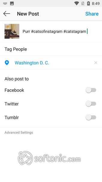 自分の写真を公開するには画面下のカメラアイコンをタップして写真をアップロードします。その際にはサイズ調整、コントラスト調整、回転、フィルター処理、タイトル設定など簡単な写真加工が可能です。また写真ごとに連携SNSを指定して共有することもできます。Instagram内外でどんなコメントや反応をもらえるか楽しみになります。